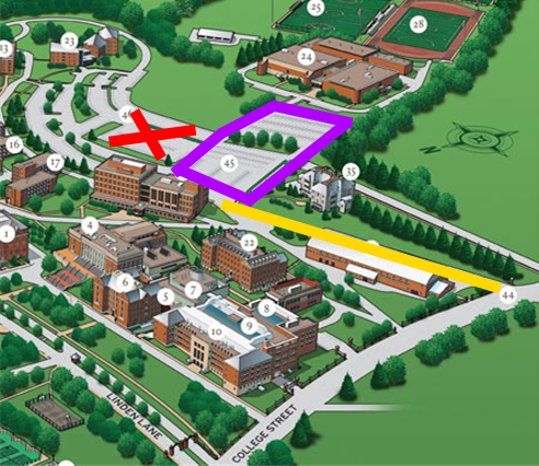 Here’s an abbreviated map with the gate 7 entrance highlighted in yellow. General parking is marked out in purple and the student/faculty parking Xed out.